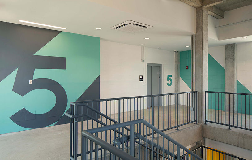 Our architects envisioned an eye-catching design with an exterior tower highlighting vibrant colors and additional lighting to make the facility aesthetically pleasing, safer, and more secure. The structure was also designed to be expanded when additional parking is needed in the future. Despite its smaller footprint, the structure has space for 700 vehicles and EV charging stations on each level, and it can be expanded to accommodate 1,000 vehicles.