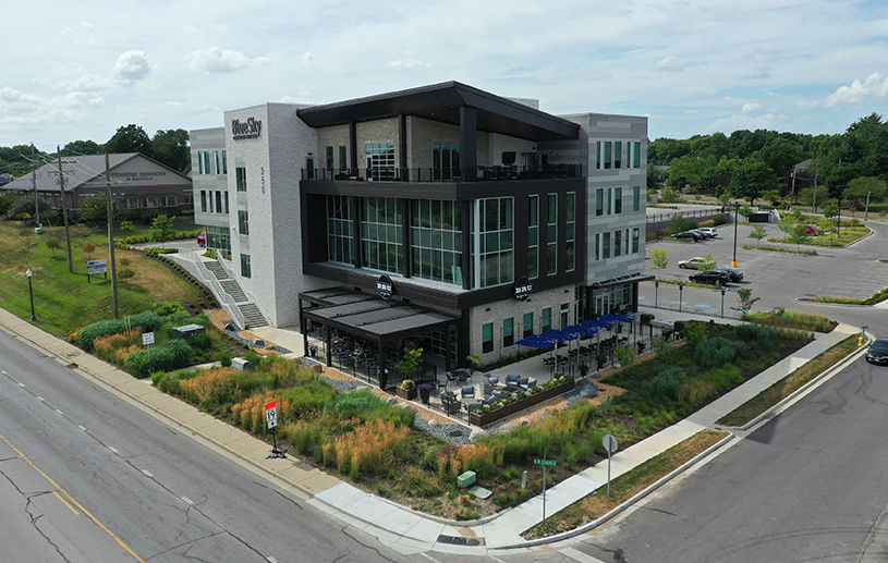 This new headquarters is a 4-story, 42,000-sft facility with the top three levels for collaborative office use. The main level at grade is intended for a restaurant tenant space and outdoor dining. An outdoor terrace off their common breakroom area on the fourth floor provides BlueSky with scenic views of historic downtown Noblesville and the new Federal Hills Commons area.
