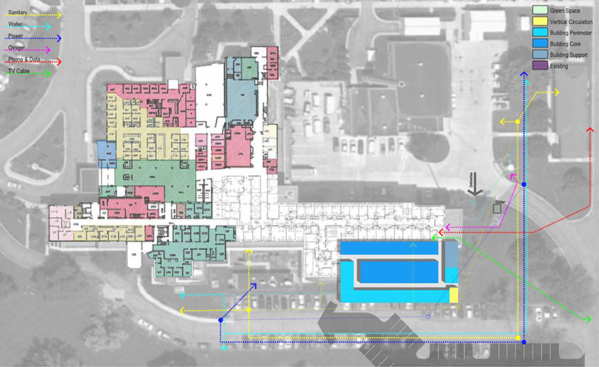 Using AutoCAD 2010, submitted drawings include Schematic Design, Design Development, and Construction Documents. Structural engineers are developing schematic foundation and framing plans, as well as Progressive Collapse and antiterrorism force protection design criteria, and structural framing systems required to meet code provisions. We are preparing a code review of the new and renovated spaces to ensure compliance with applicable codes and VA standards. Many utilities are located within the addition footprint and are relocated due to this project. Additionally, site amenities such as walks and parking lots are being modified to accommodate the addition.